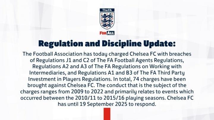 在公告中,英足总表示,“英格兰足球总会今日对切尔西足球俱乐部提出指控,其违反《英足总足球经纪人条例》J1和C2条款、《英足总中介合作条例》A2和A3条款,以及《英足总第三方球员投资条例》A1和B3条款。切尔西俱乐部共面临74项指控,涉及2009年至2022年期间的违规行为,主要集中于2010/11至2015/16赛季期间。切尔西俱乐部需于2025年9月19日前就此作出回应。”
